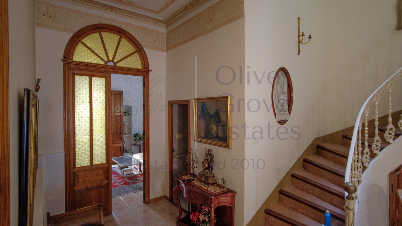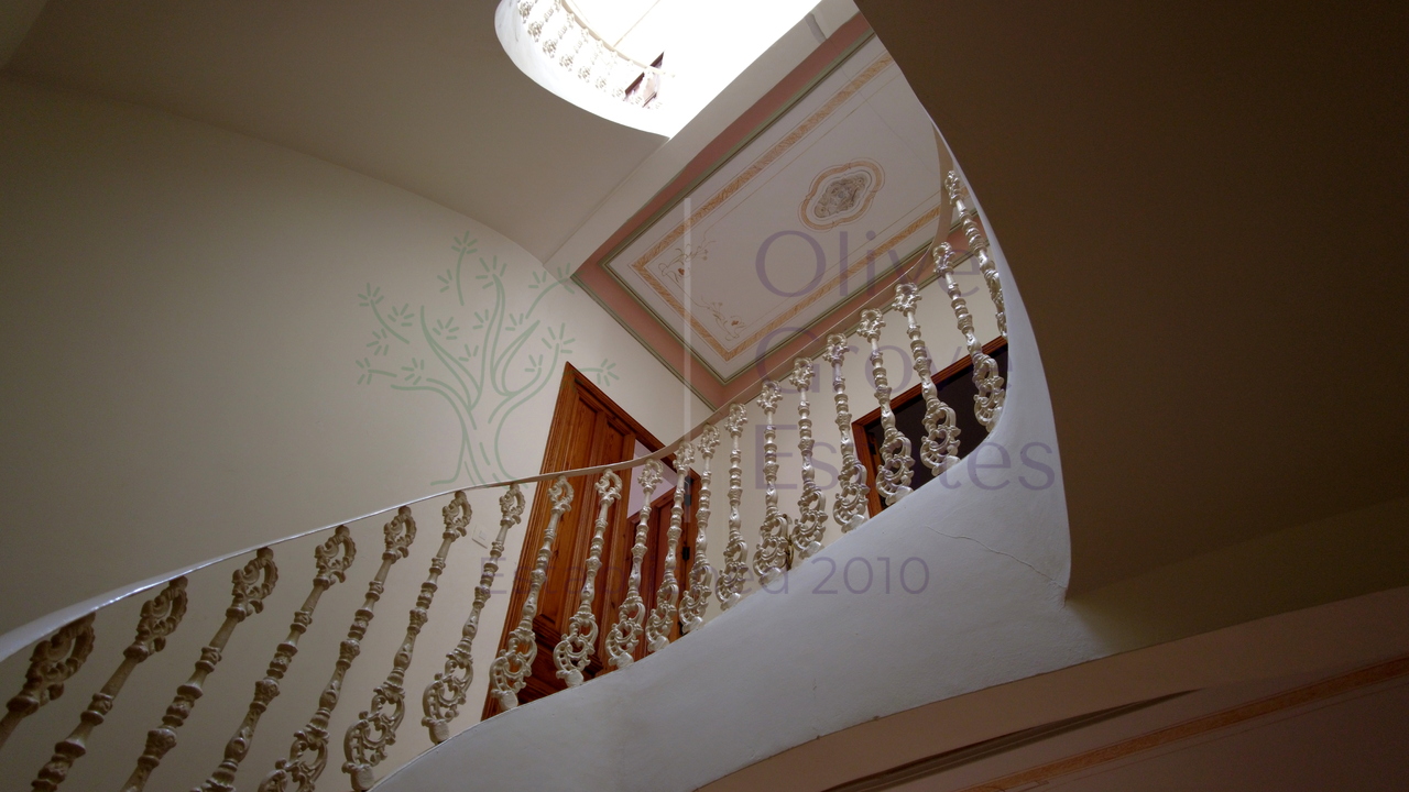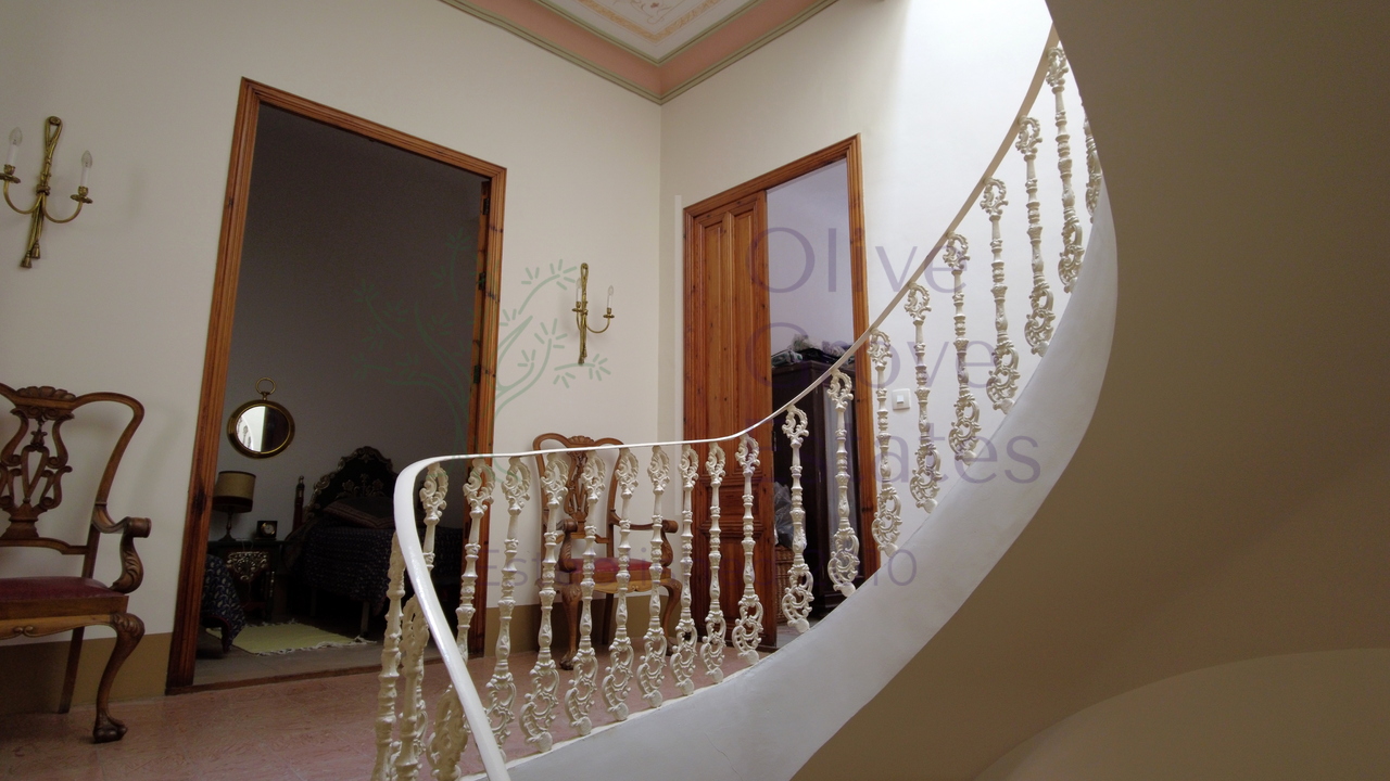 As you enter the house from the street, you enter the main hallway on the ground floor. Featured on this floor is a spacious living room adorned with a cozy fireplace, creating a warm and inviting atmosphere. Two small rooms facing the street provide versatile spaces that can be used as studies, home offices, or even guest rooms. A dining room offers ample space for family gatherings and entertaining guests. The kitchen, conveniently connected to an interior patio, provides a peaceful retreat for culinary endeavors. The interior patio is a charming and private place to relax during the hot summer evenings and also provides access to a covered roof terrace and utility room. Completing this floor is a bathroom with a bathtub, offering comfort and convenience for residents and visitors alike. The main highlight of this floor is the stunning central staircase, which spans all three floors and is bathed in natural light from the skylight on the third floor. The double-height ceilings and ornate decorations throughout the house add a touch of grandeur and elegance.