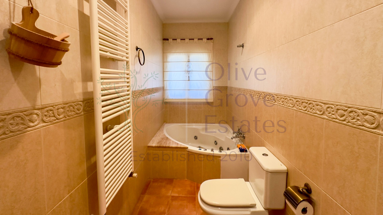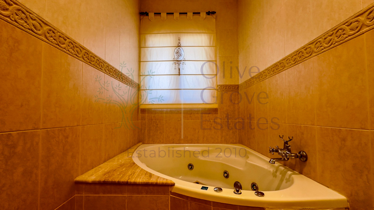 A hallway leads to four spacious double bedrooms, all with built-in wardrobes for convenience. The master bedroom includes an elegant en-suite bathroom complete with a Jacuzzi tub, offering a touch of luxury. The home also includes a second full bathroom for family or guests.