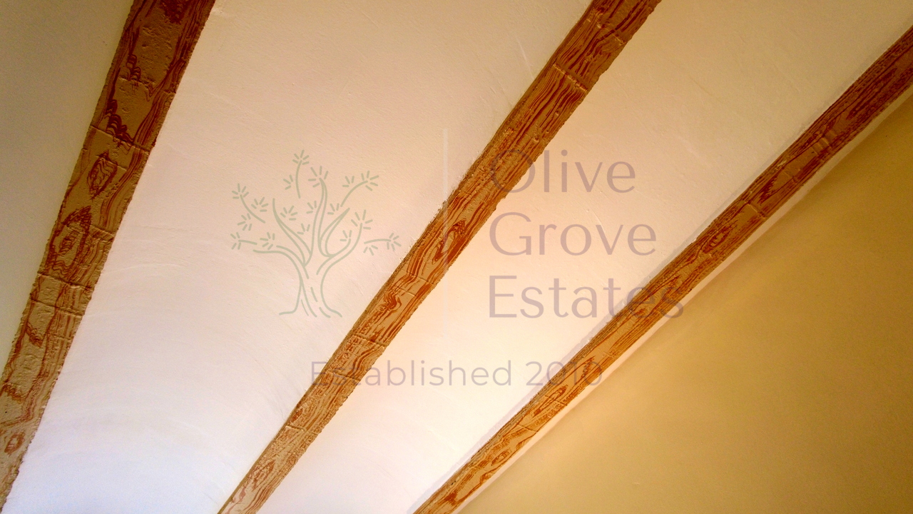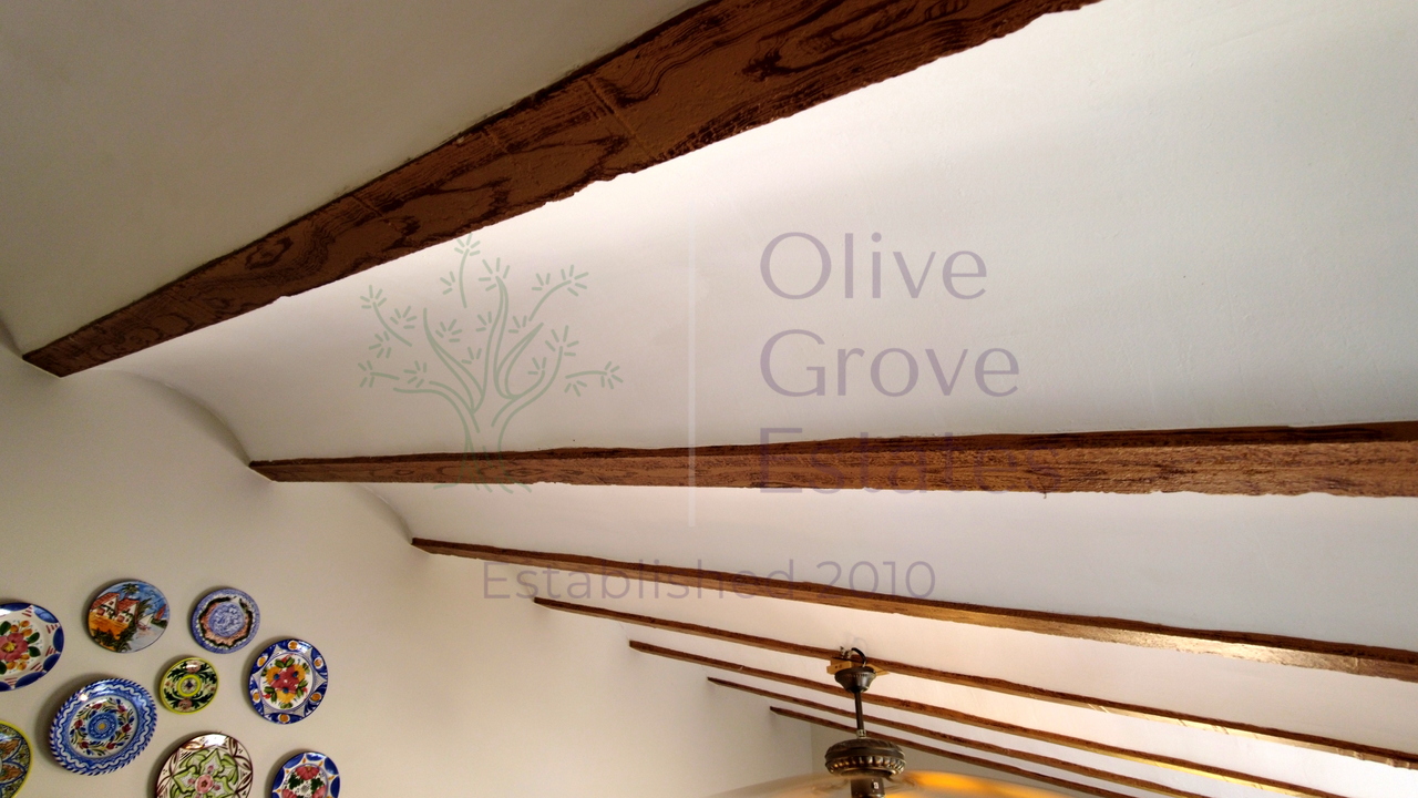 - Living space with high beamed ceilings and a focal fireplace