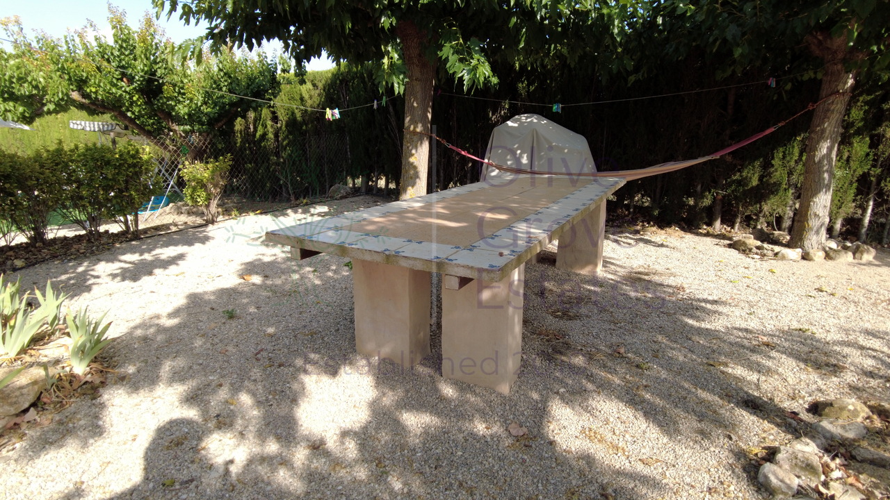 At the back of the house, you'll discover a well-maintained outdoor kitchen and barbecue area, equipped with running water and electricity. This space is perfect for entertaining and al fresco dining. Directly opposite, a large family stone table sits under the natural shade of trees, providing a serene setting for outdoor meals. The pool area, separated from the rest of the grounds by lush bushes and a charming archway, offers a magical sense of privacy and purpose. The immaculate pool, complete with a patio and sunbathing area, features its own pump house, ensuring a perfect spot for relaxation and recreation.