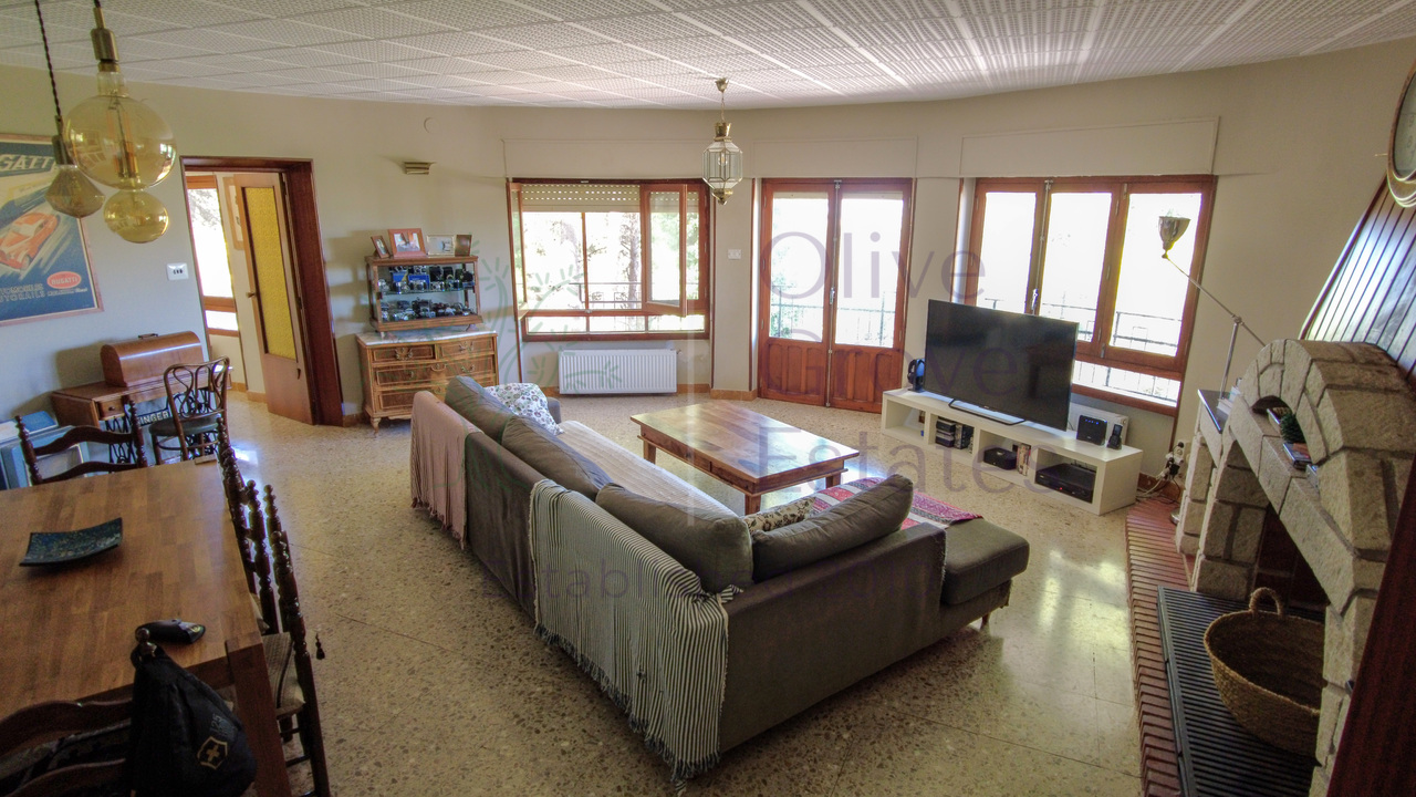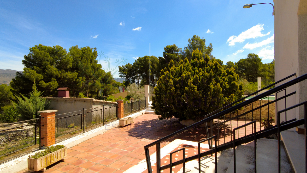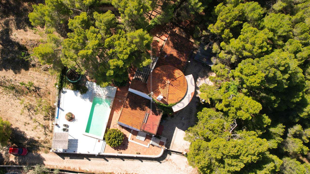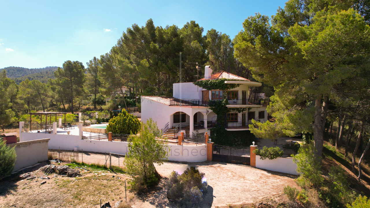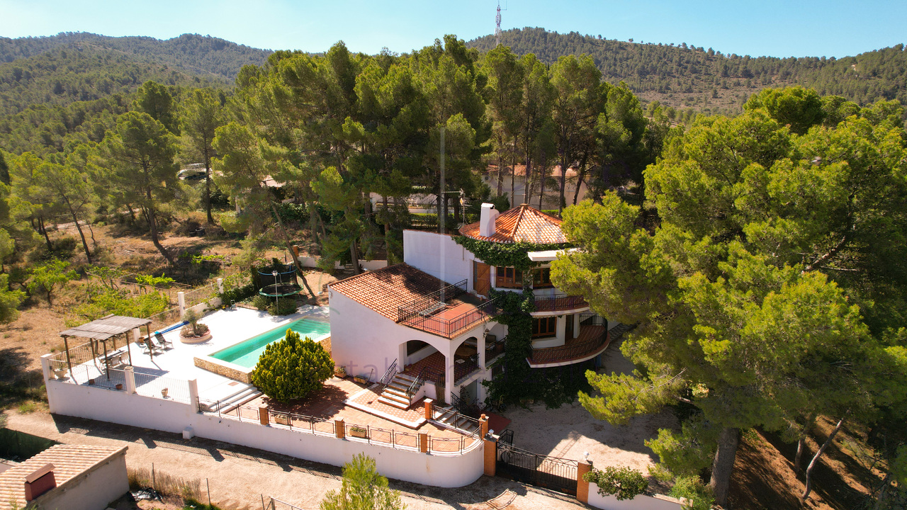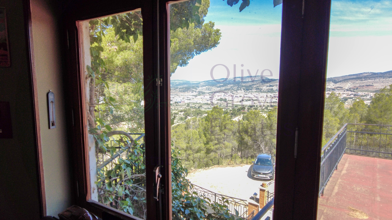 This beautiful property is nestled in a small urbanization of just six houses, situated within the protected natural area of the Sierra de Ibi, and is only 2 kilometers from the town center. It features mains water, electricity, and oil central heating throughout the house, making it suitable for year-round living. The plot spans 3,302 m² and boasts unique 1970s architecture, characterized by a central circular tower with two wings on each side.