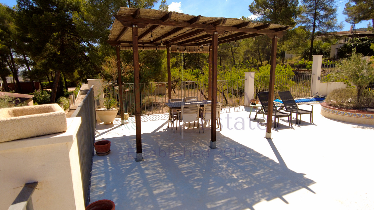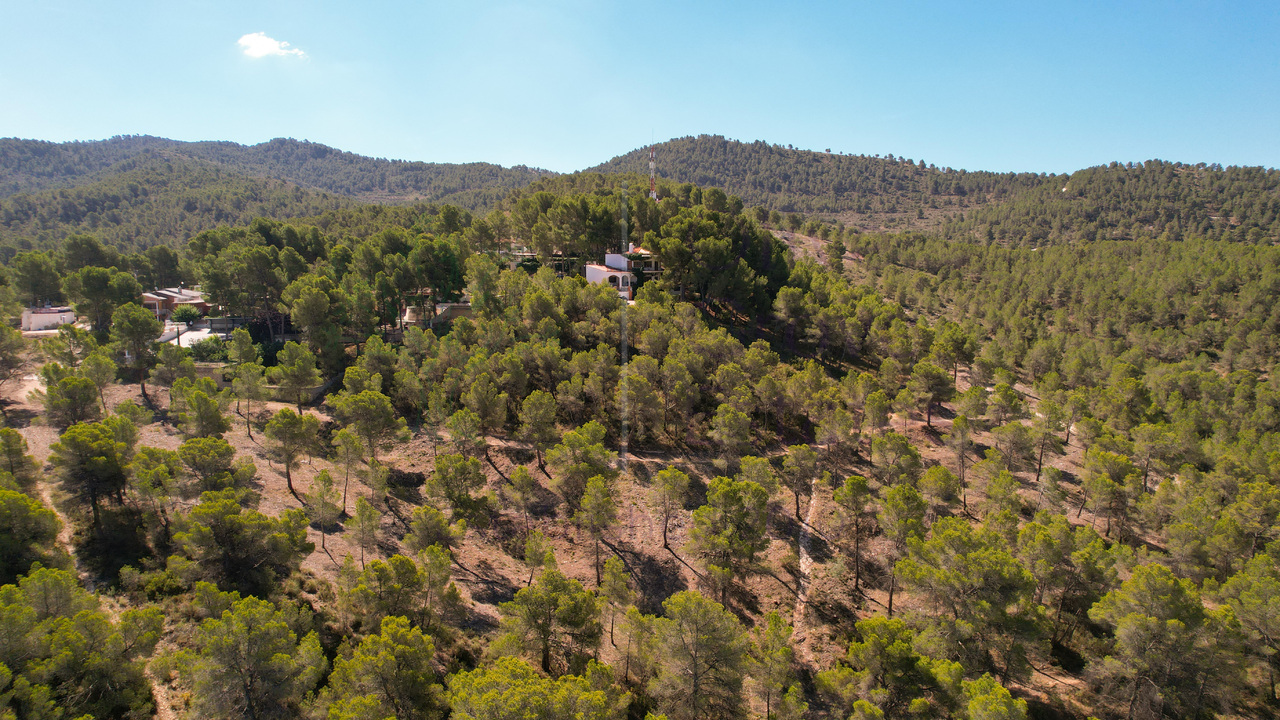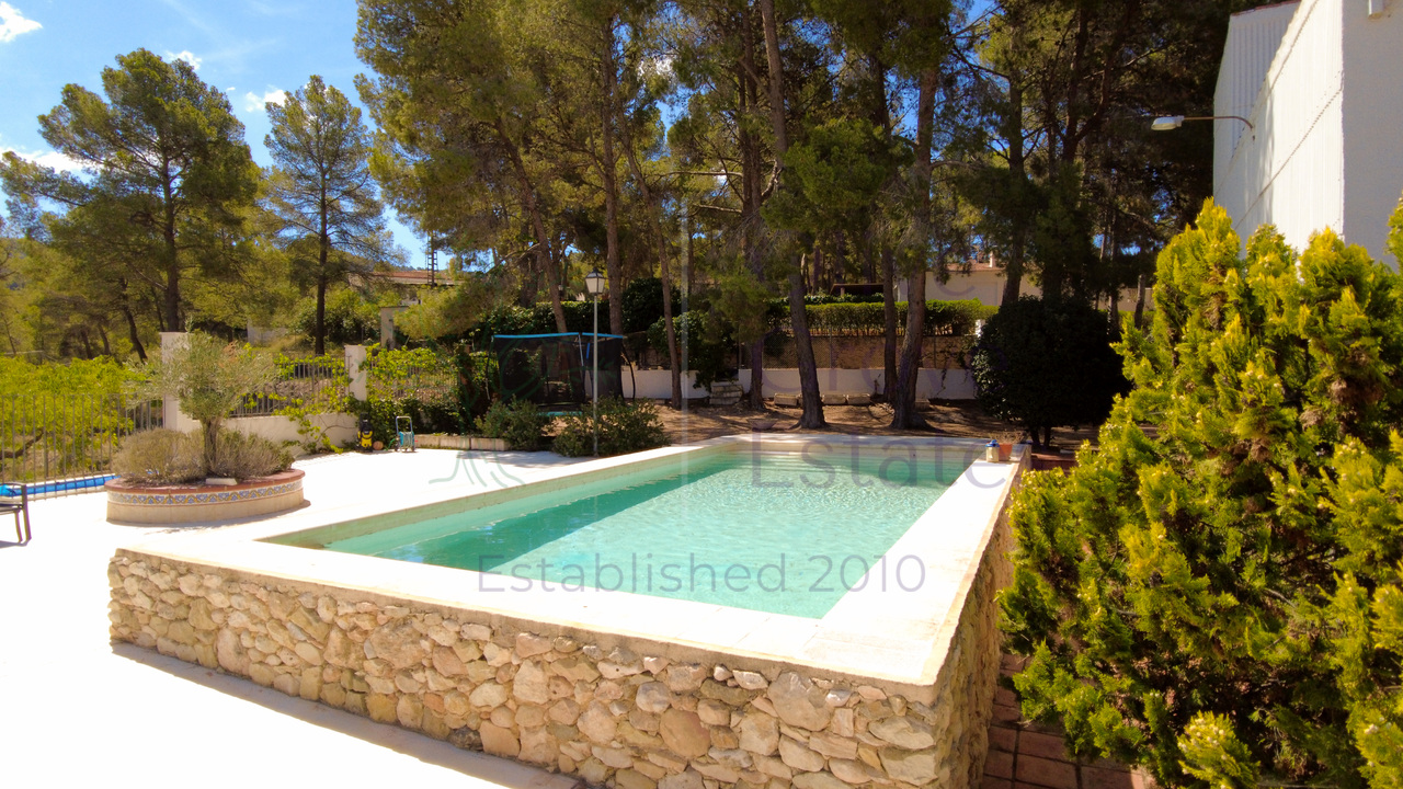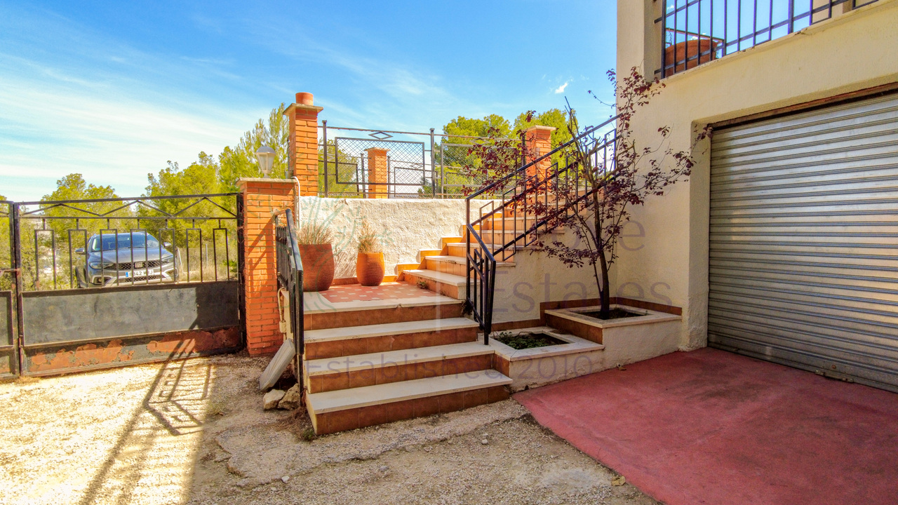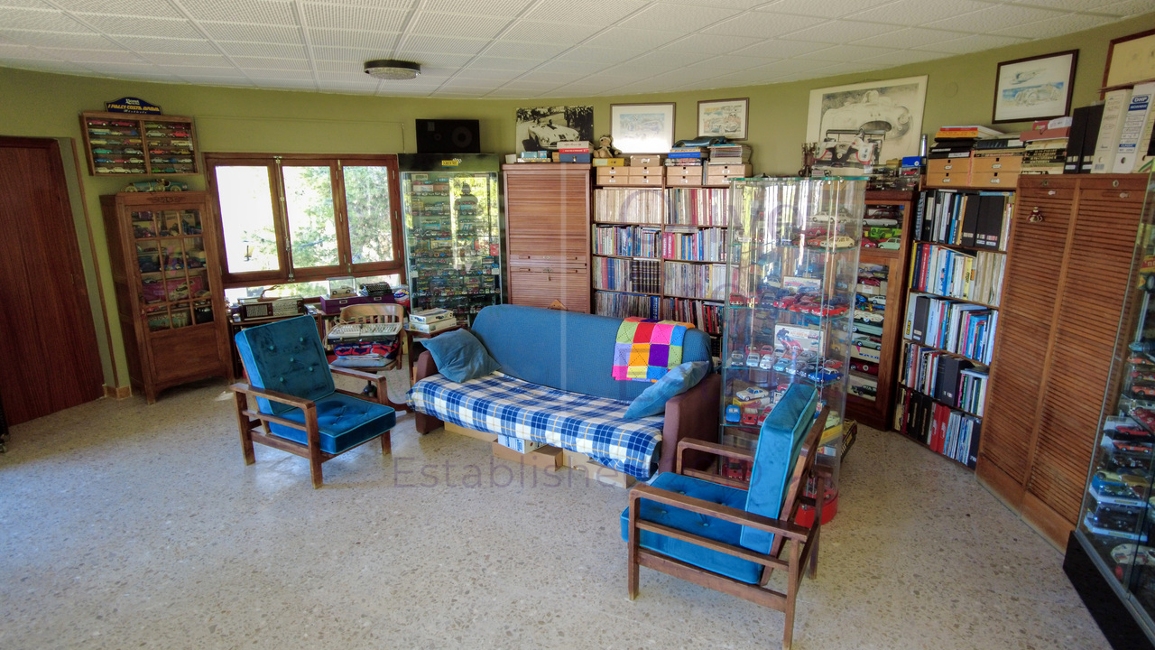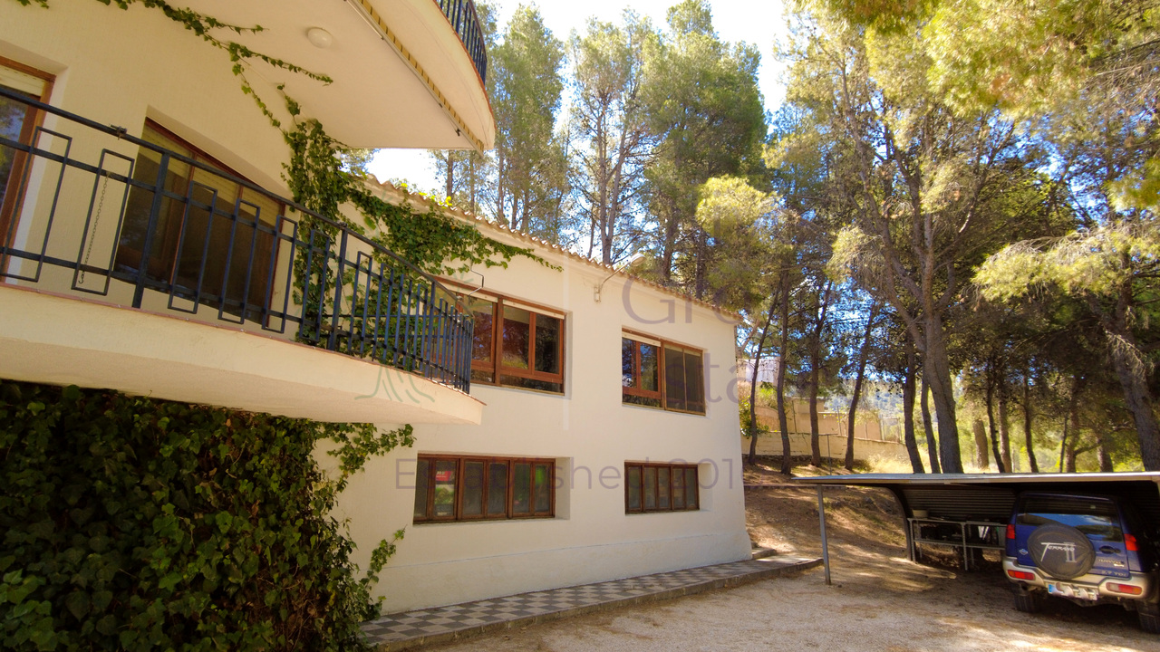 This beautiful property is nestled in a small urbanization of just six houses, situated within the protected natural area of the Sierra de Ibi, and is only 2 kilometers from the town center. It features mains water, electricity, and oil central heating throughout the house, making it suitable for year-round living. The plot spans 3,302 m² and boasts unique 1970s architecture, characterized by a central circular tower with two wings on each side.