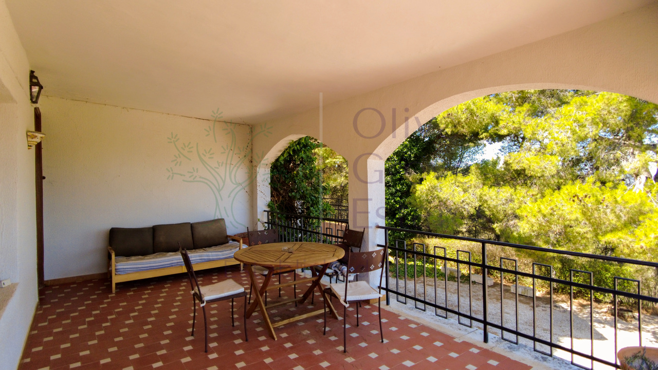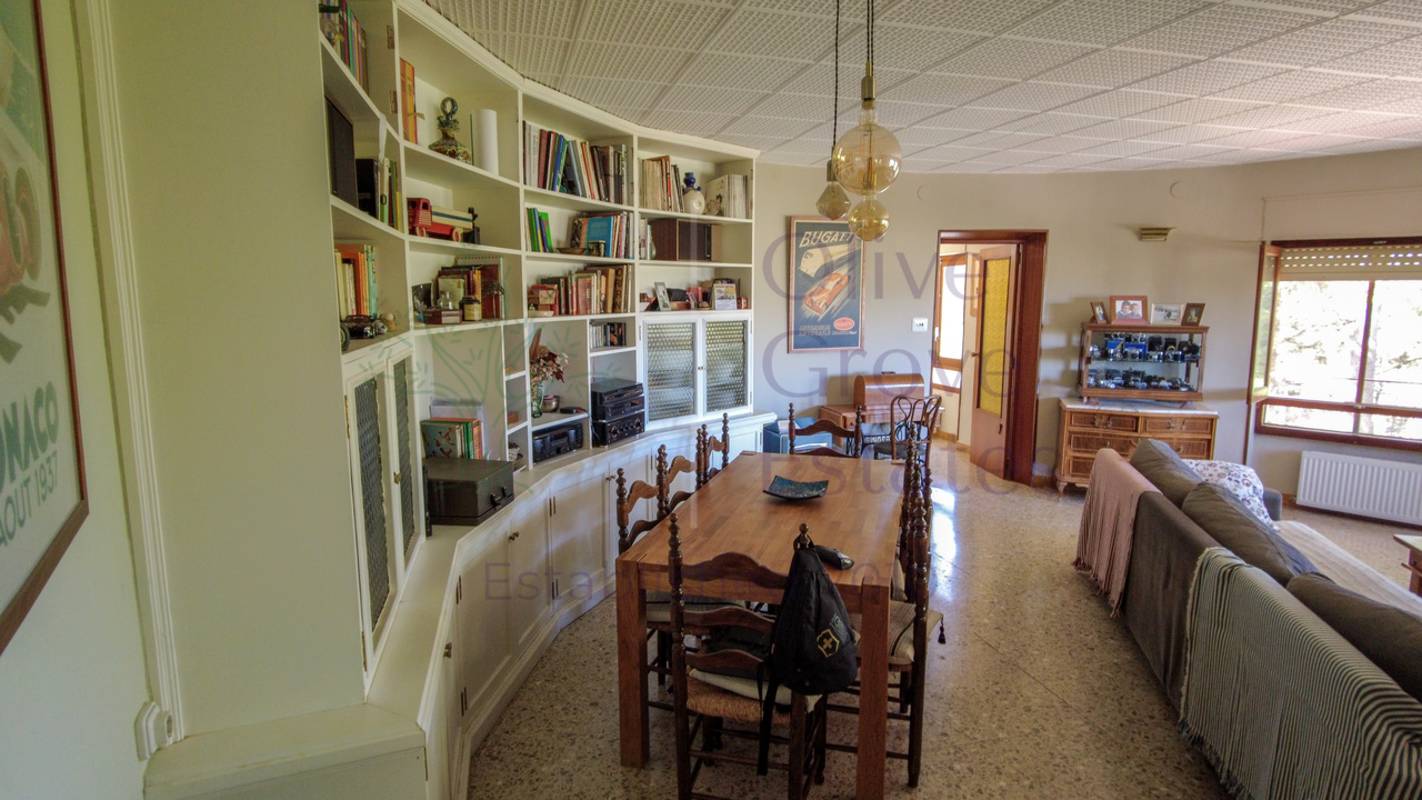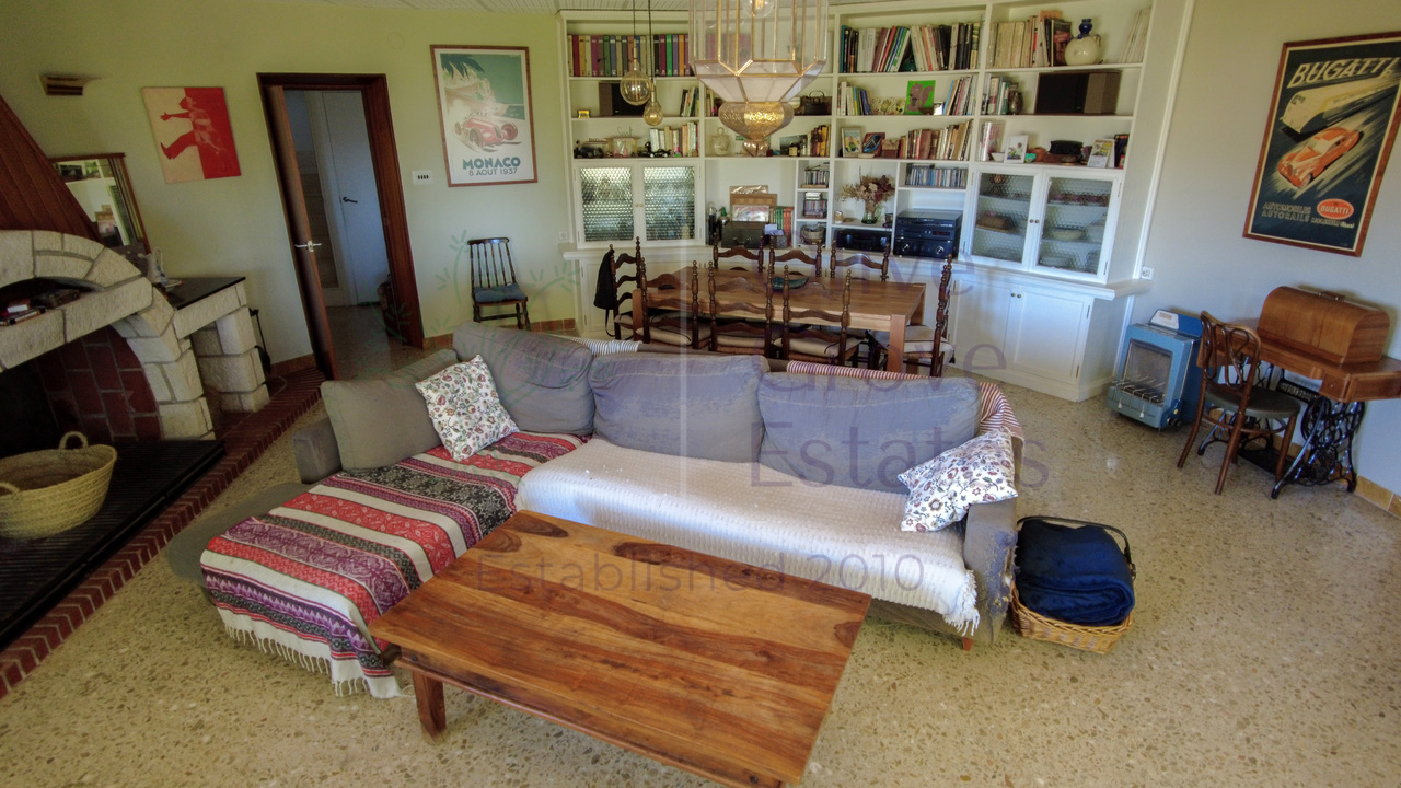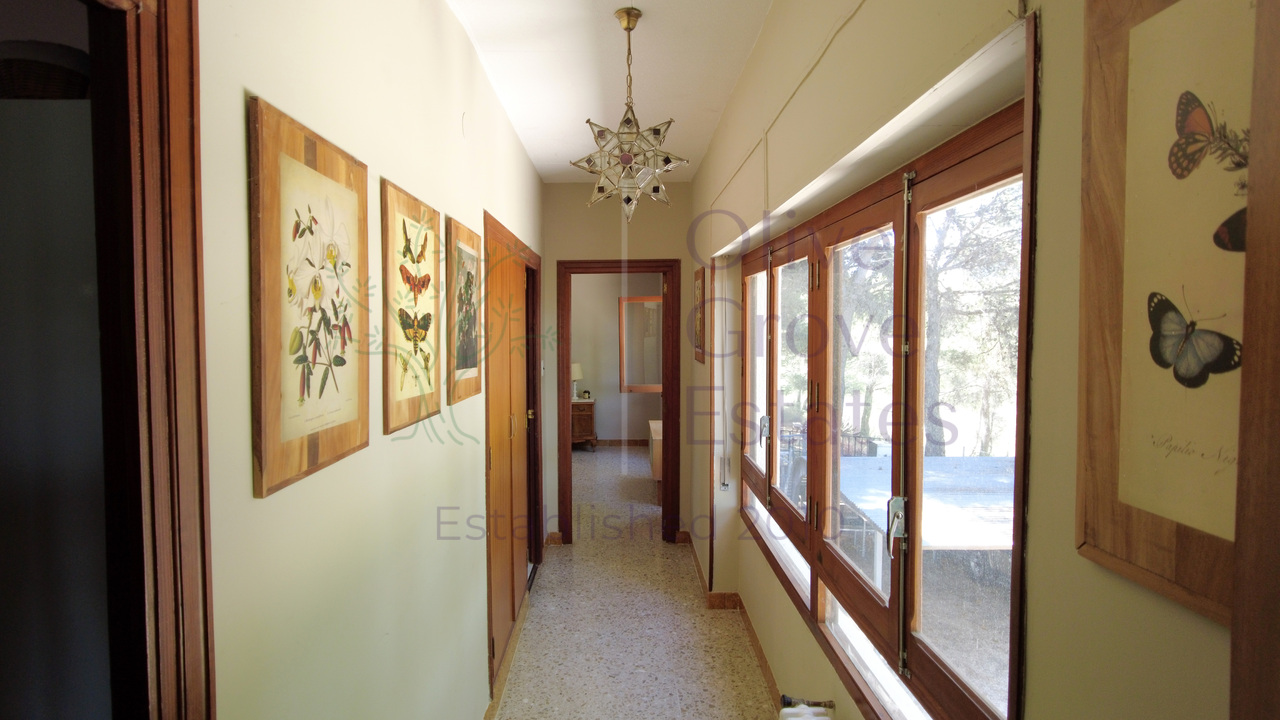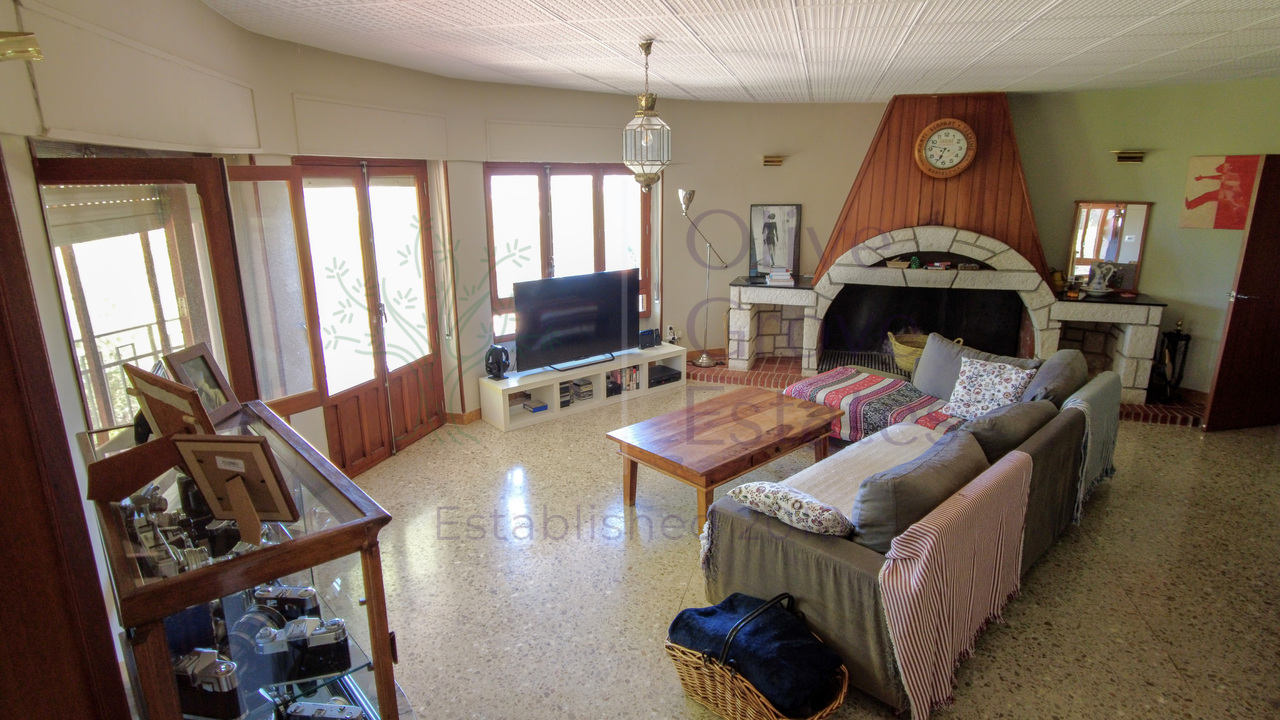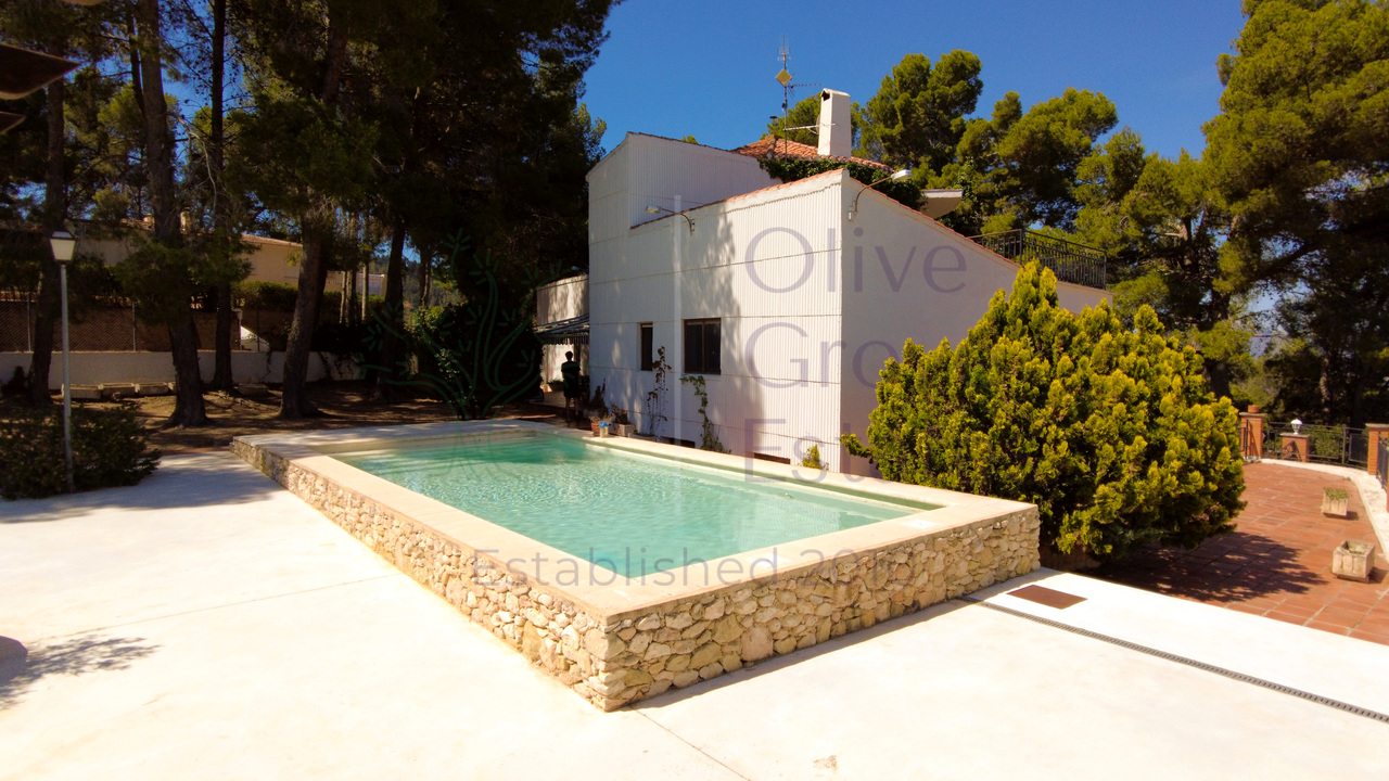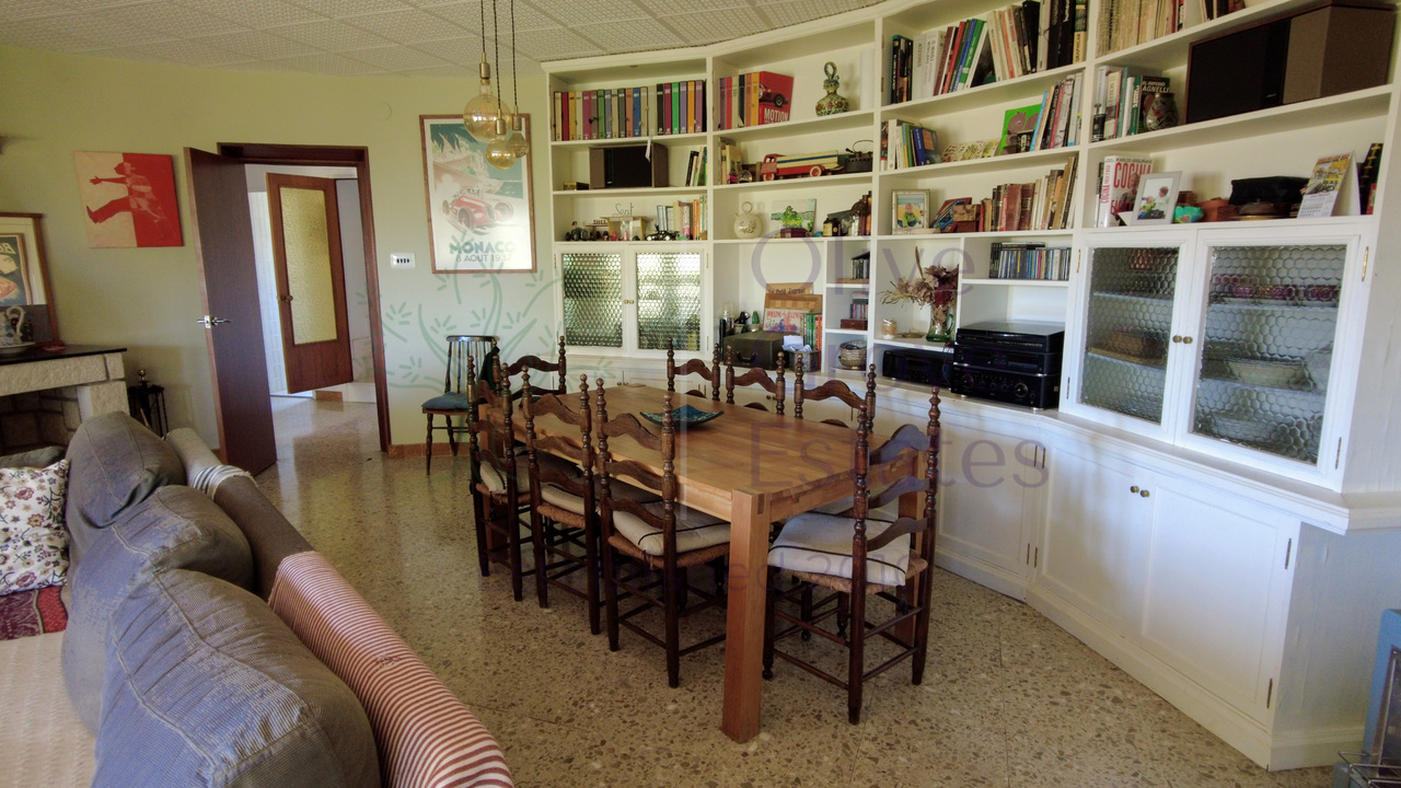 This beautiful property is nestled in a small urbanization of just six houses, situated within the protected natural area of the Sierra de Ibi, and is only 2 kilometers from the town center. It features mains water, electricity, and oil central heating throughout the house, making it suitable for year-round living. The plot spans 3,302 m² and boasts unique 1970s architecture, characterized by a central circular tower with two wings on each side.