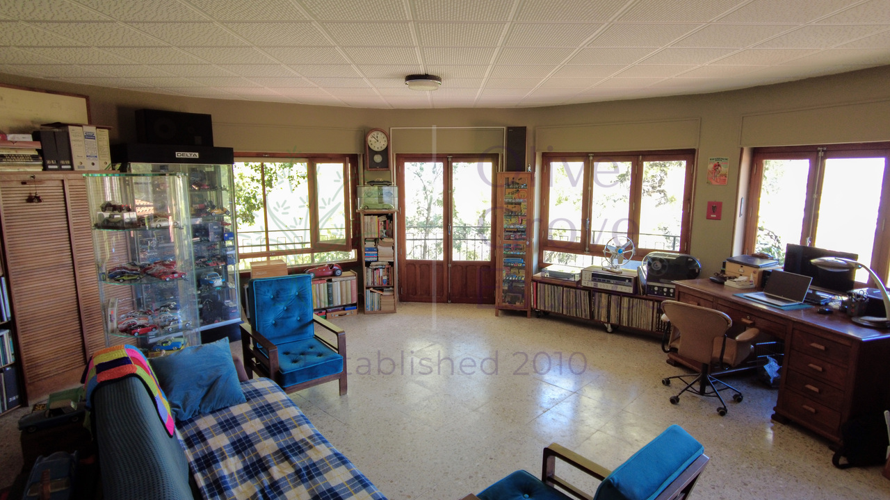The ground floor includes a spacious garage that can accommodate two cars, with an additional covered parking area outside for two more vehicles. There's also an open-plan space perfect for a wine cellar, gym, or games room. On the first floor, you'll find a circular living room of approximately 40 m², a kitchen, a bathroom, a toilet, and three bedrooms, one of which is a double. The top floor houses a studio, also circular and the same size as the living room, which can serve as an additional living area, bedroom, or office space, along with a 20 m² solarium.