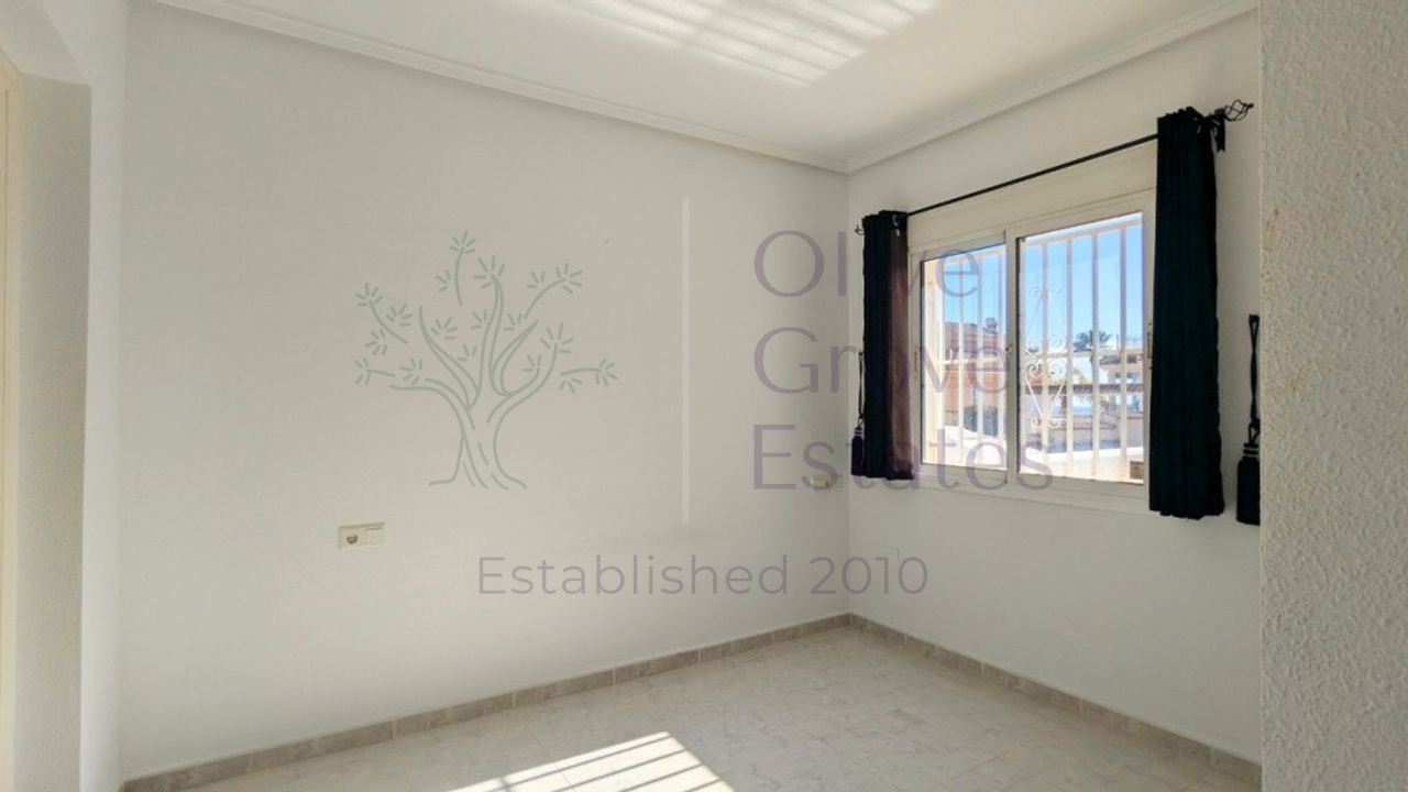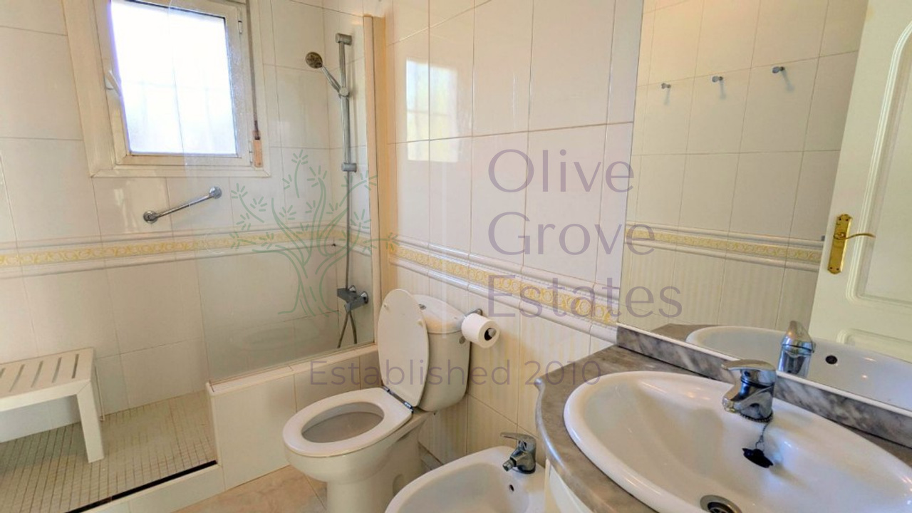 The villa offers three generous double bedrooms, each with built-in wardrobes providing ample storage. The master suite features a private en-suite bathroom, while a second full bathroom and an additional guest toilet serve the rest of the home.